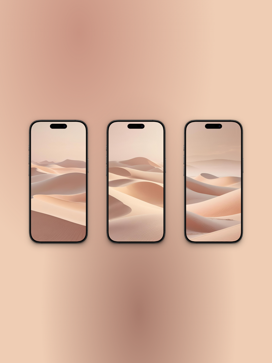 Cada uno presenta una composición minimalista de dunas de arena ondulantes en suaves tonos beige y melocotón. Con suaves degradados y una atmósfera etérea y difusa, estos fondos de pantalla en formato vertical son perfectos para crear una estética relajante y elegante en cualquier pantalla de móvil.